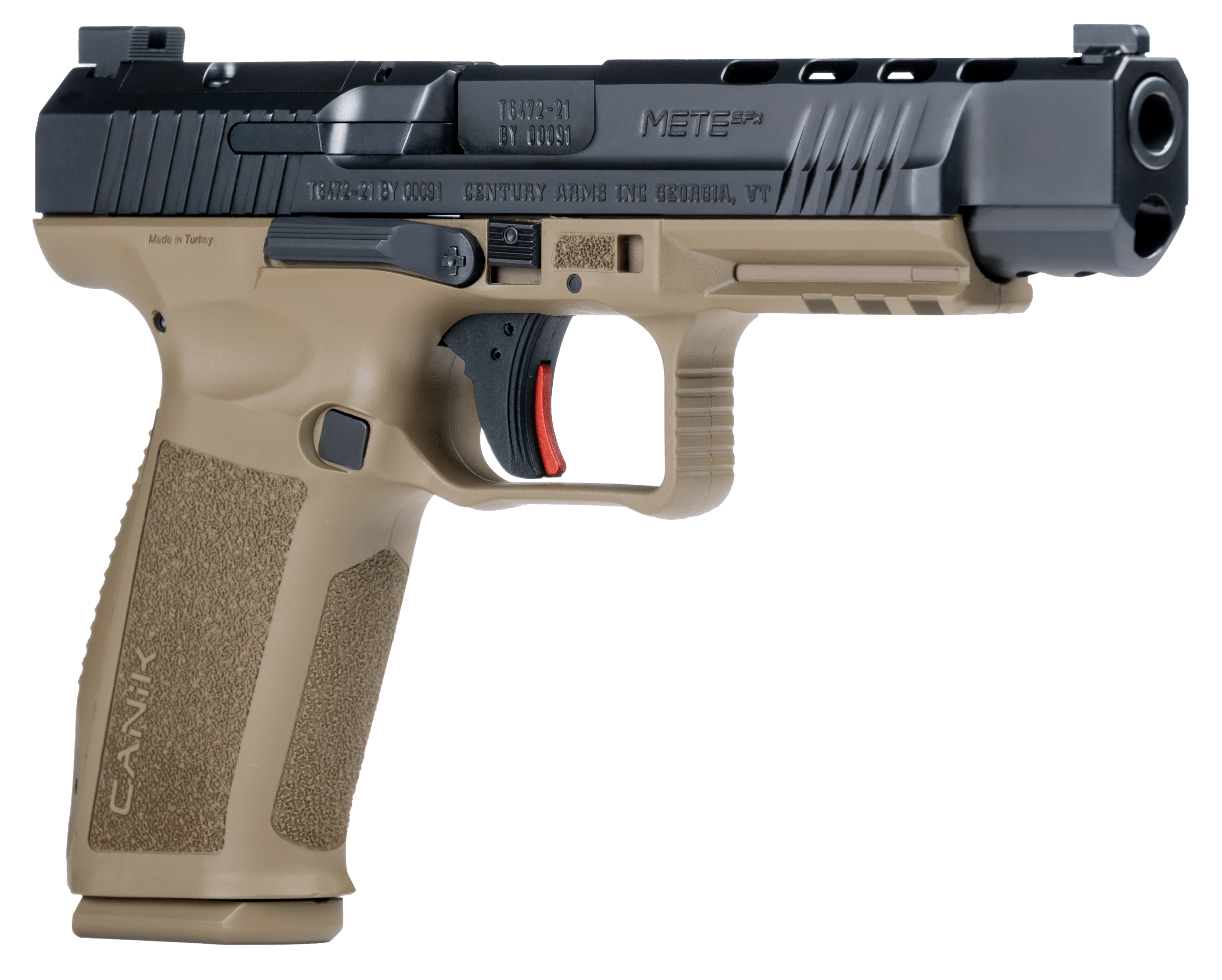 Canik HG5635N Mete SFx Full Size Frame 9mm Luger 20+1/18+1, 5.20″ Black Match Grade Barrel Black Nitride Serrated Steel Slide, Flat Dark Earth Polymer Frame w/Picatinny Rail, Ambidextrous