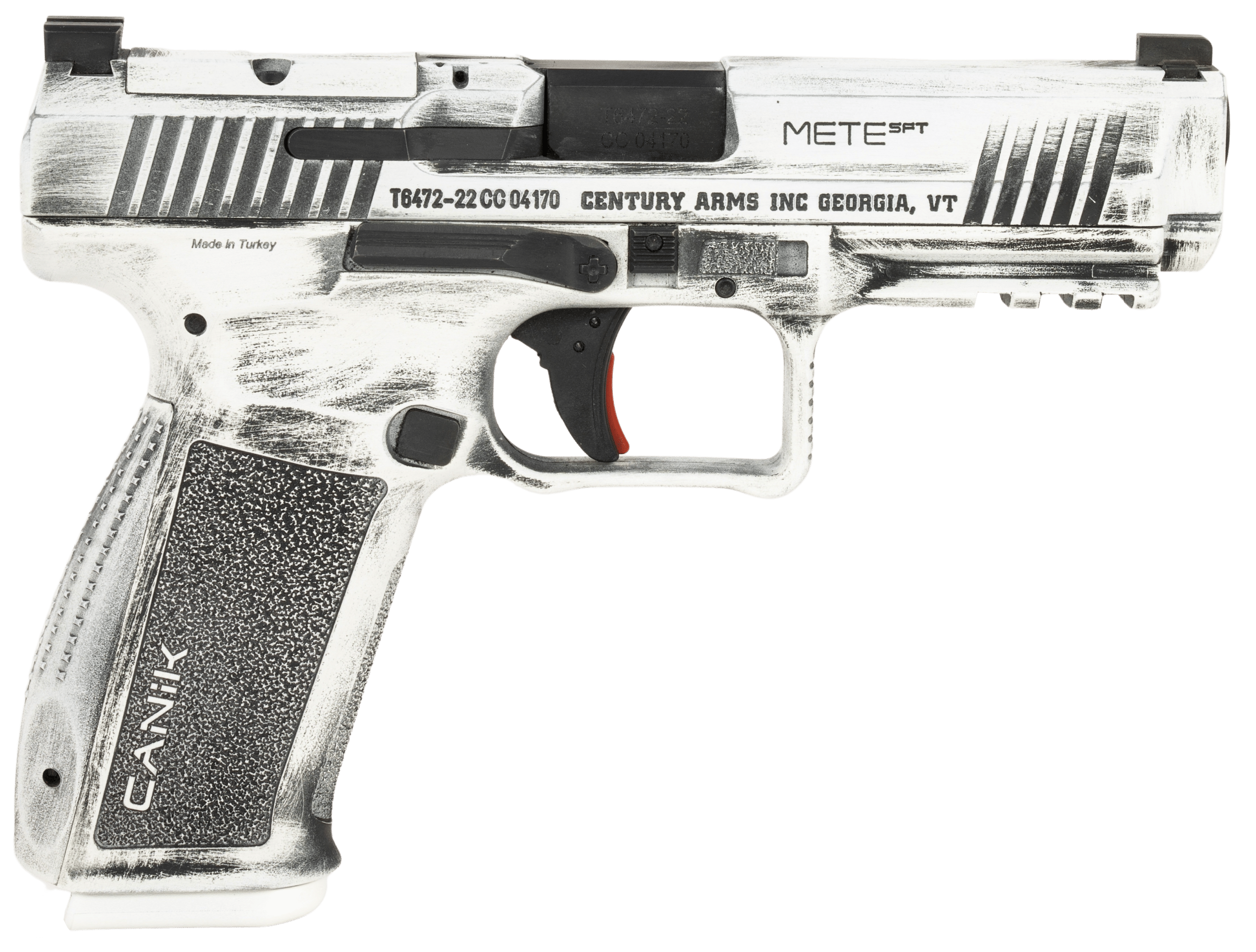 The Canik Mete SF features an integrally flared mag-well; double undercut trigger guard; redesigned beavertail; short reset SA trigger; aggressive grip texturing; side reversible magazine catch; 3-Dot white sight and a co-witnessing optics ready slide cut now accepting everything from a Trijicon RMRcc all the way to a micro optic. Includes a hard case, two standard capacity magazines, magazine E-Z loader, Speed mag-well, extra back strap, two optics bases, reversible IWB/OWB holster, Canik punch and toolkit, cleaning kit, gun lock and manual.