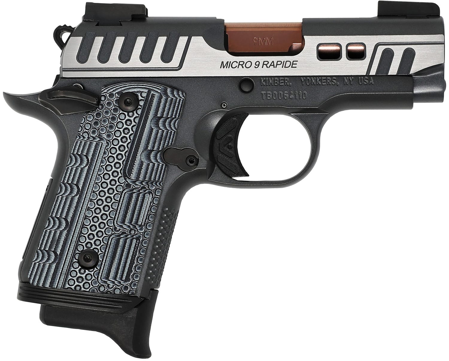 Kimber Mfg, Inc 3300235 Micro 9 Rapide Dusk Micro Frame 9mm Luger 7+1 3.15″ Rose Copper TiN Match Grade Barrel, Kim Pro II Black/Silver Lightening Cut/Serrated Stainless Steel Slide, Kimpro II Gray Aluminum Frame w/Beavertail, Black/Gray G10 Grip