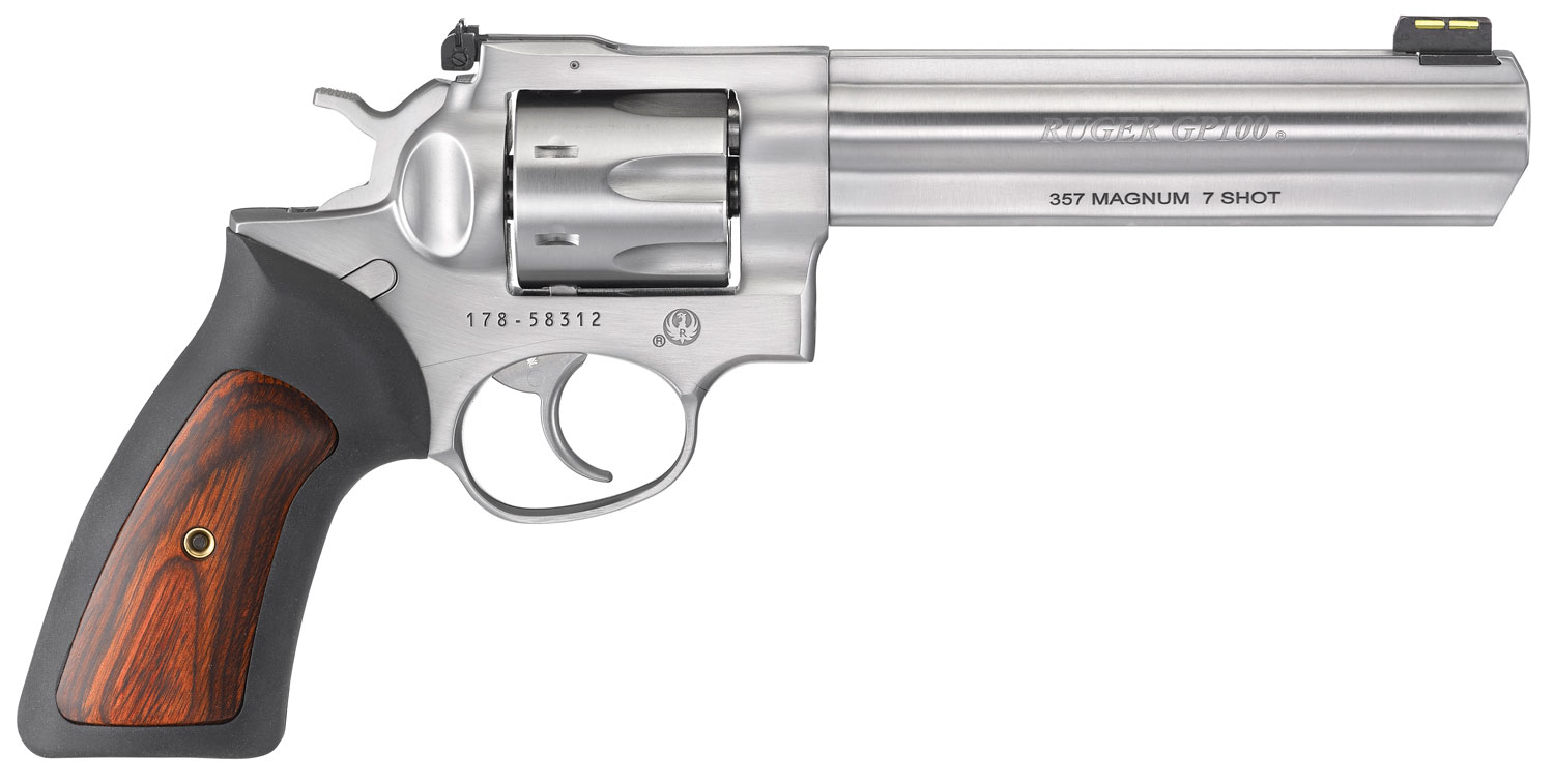 Ruger 1773 GP100 357 Mag 7 Shot, 6″ Satin Stainless Steel Barrel, Satin Stainless Cylinder, Satin Stainless Steel Frame, Black Rubber w/Wood Insert Grip, Exposed Hammer