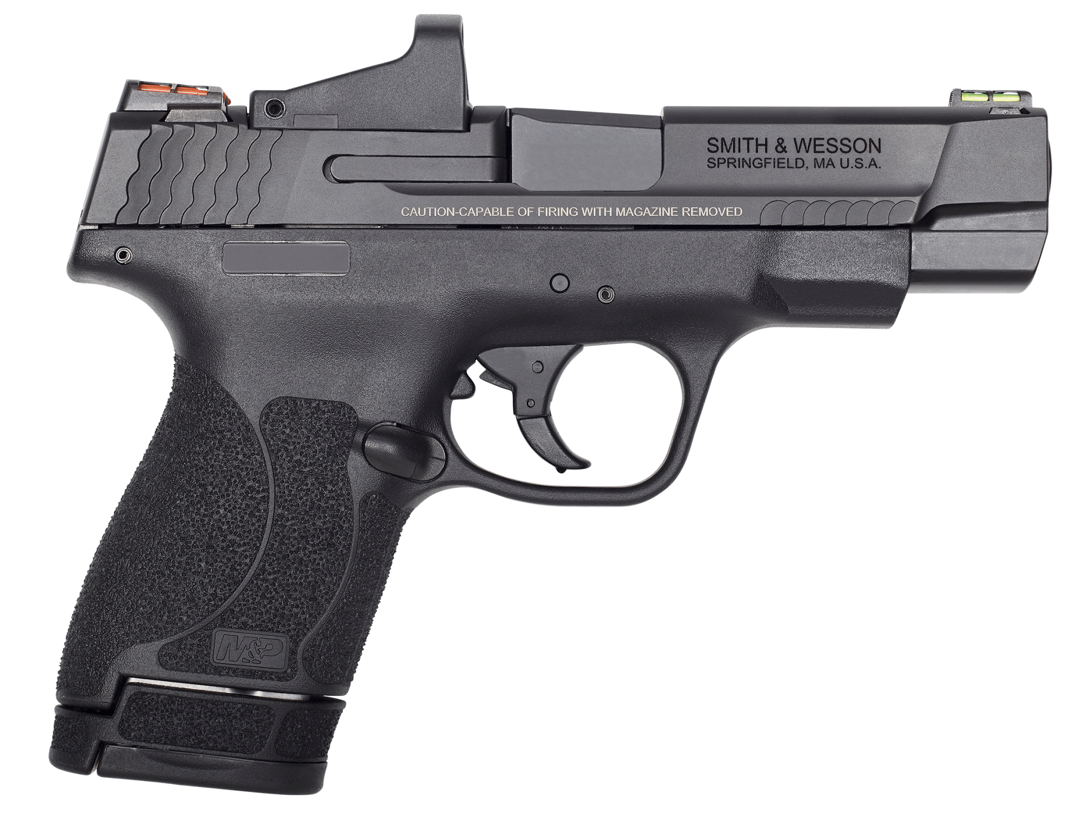The S&W Performance Center Shield M2.0 is an easy to conceal pistol that offers professional grade features with simple operation and reliable performance day or night. Featuring fiber optic sights; front cocking serrations; slim compact profile; aggressive grip texture; tactile and audible trigger reset; embedded stainless steel Chassis System and an Armornite durable corrosion resistant finish. Includes 4 MOA red dot, two magazines and cleaning kit.