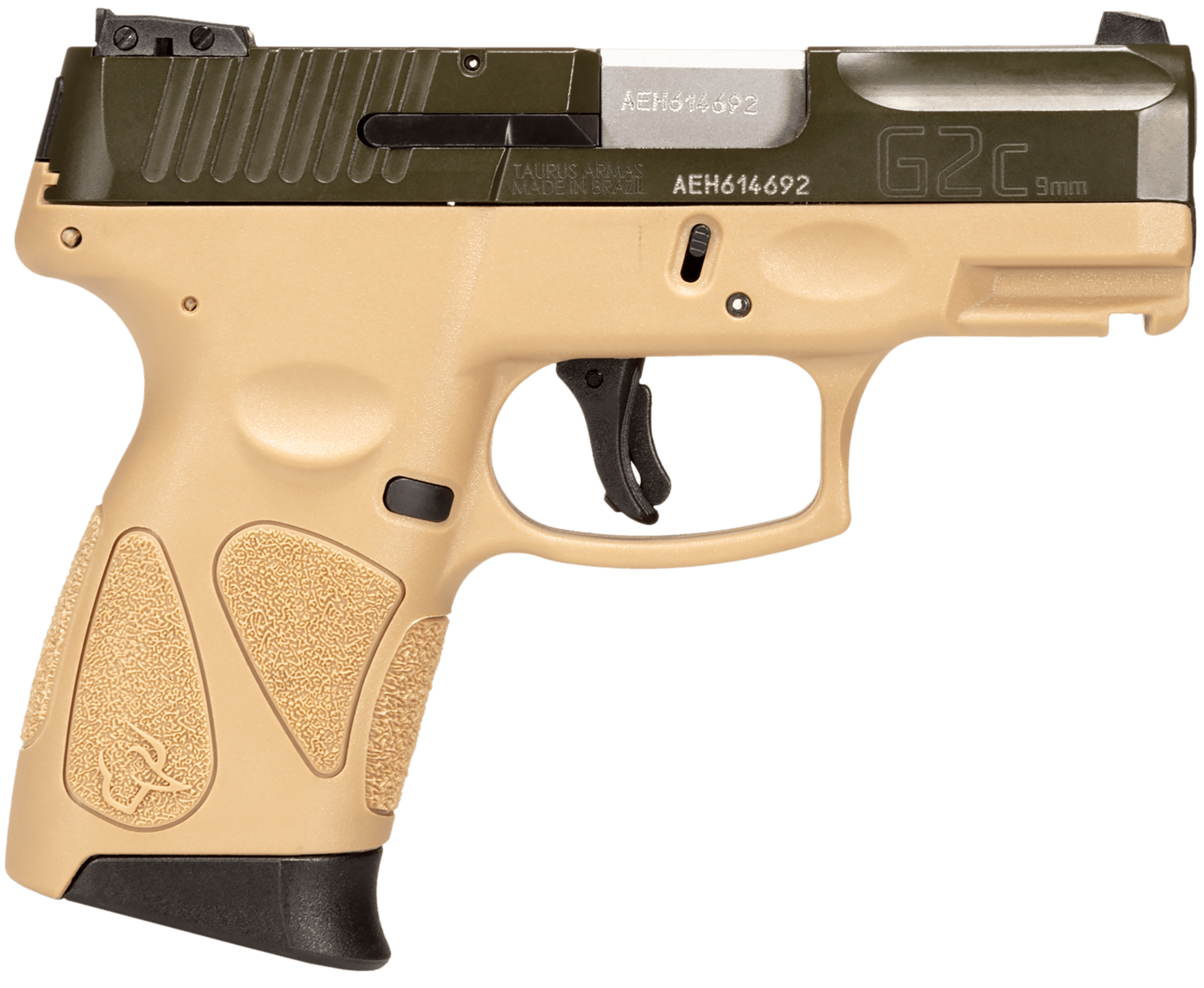 Taurus 1-G2C93B-12T G2C Compact Frame 9mm Luger 12+1 3.26″ Matte Stainless Steel Barrel, Moss Green Cerakote Serrated Steel Slide, Coyote Tan w/Black Controls Polymer Frame w/Picatinny Rail & Polymer Grip, Right Hand
